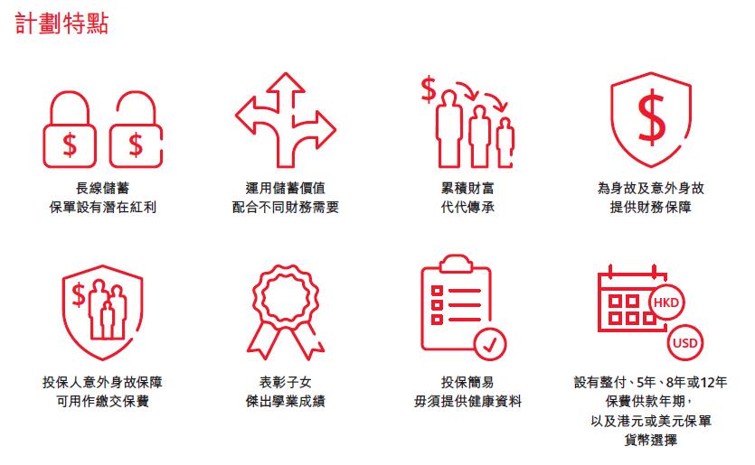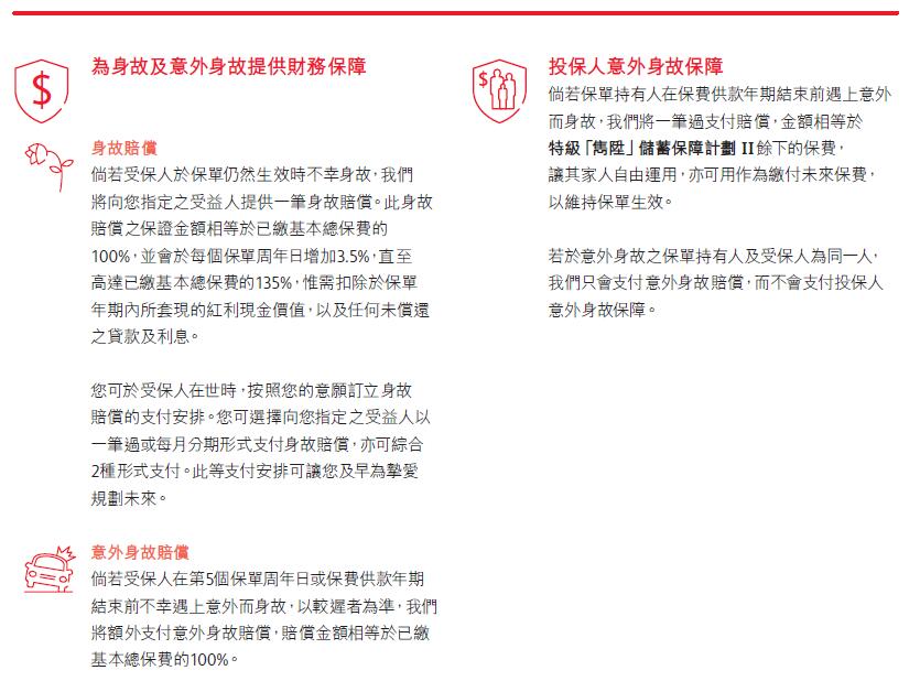 是一份终身寿险计划,专为长线储蓄而设,配合您不同的财务目标。计划亦同时提供保证及非保证权益,助您累积财富或将财富传承后代。为进一步保障您的挚爱,计划更额外提供身故及意外身故保障。