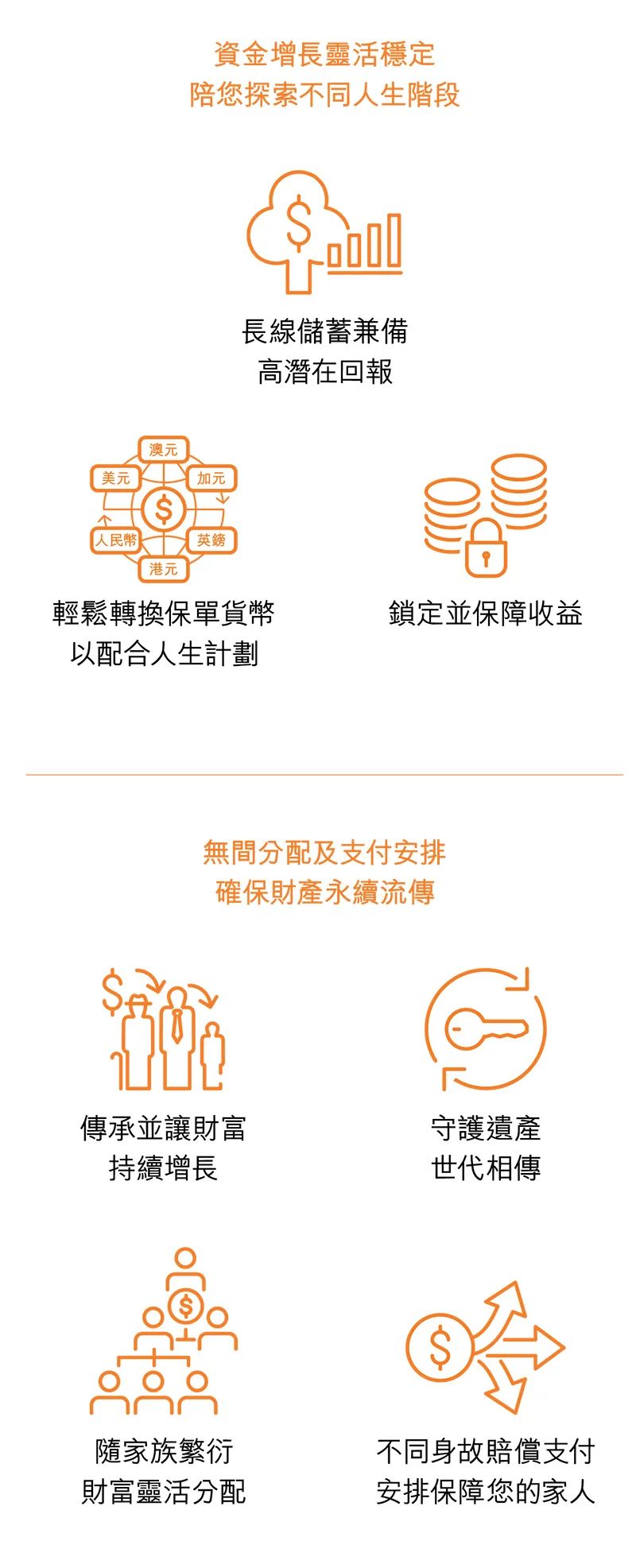 是一个灵活的综合终身人寿储蓄计划,让您按照不同人生阶段的需要,随时改变您的财务大计。计划能为您建立财富、锁定增长,并让您灵活地将丰硕成果无限传承下去。