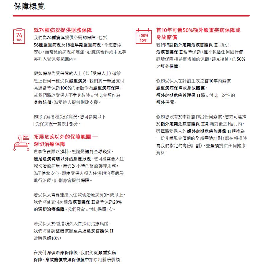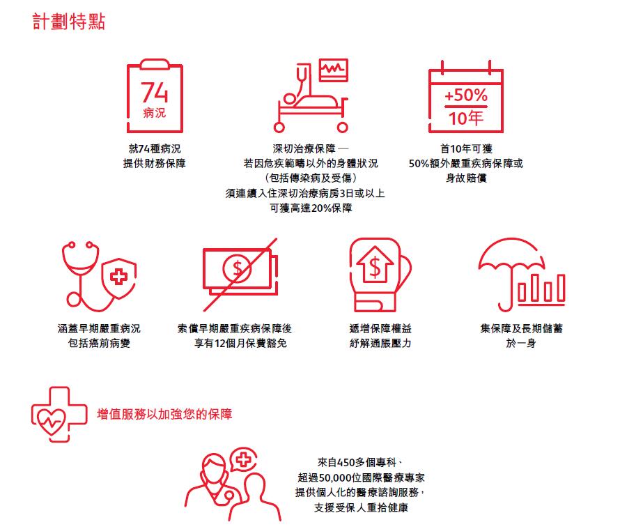 提供终身危疾保障,就74种病况提供一笔过赔偿,助您对抗顽疾。您只需于有限供款年期内缴付相宜保费,就可以获得一份全面保障。当您在危疾范畴以外的身体状况(包括传染病及受伤)而须入住深切治疗病房时,计划亦会提供保障。